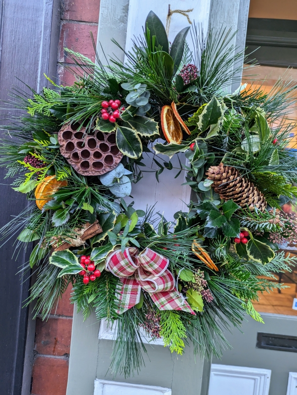 A beautiful fresh winter foliage Christmas door wreath decorated with cones, orange slices ,berries etc finished with a bow. Available from 2nd December.