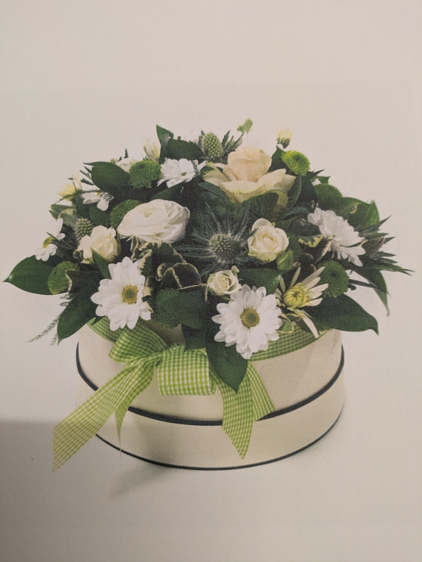 A cute glass vase filled with white and green blooms for a serene Christmas/