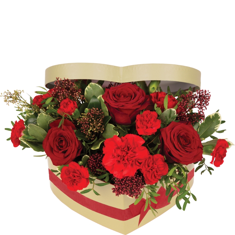 A heart shaped hat box filled with roses, carnations and wax flower.